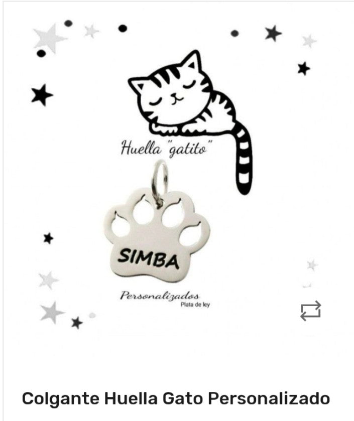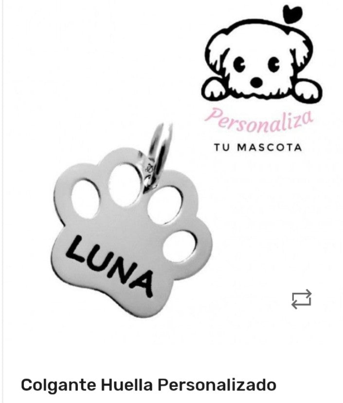 Precioso colgante para tu mascota, en plata de ley 925. Diseño de huella para personalizar el nombre de tu perro o gato. También puedes poner el tlf. Nuestra mascota también se merece tener su propio colgante con Nombre.