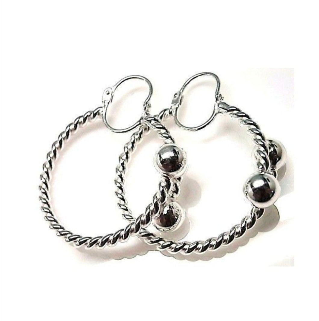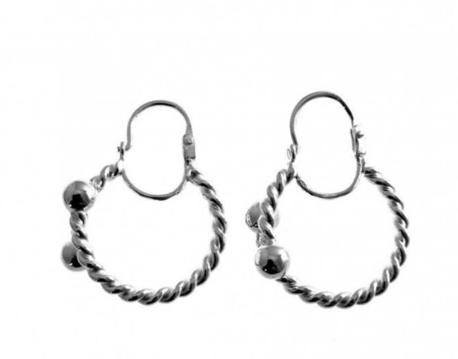 Pendiente rizado en Plata de Ley, con terminación en bolas de Plata, en tres tamaños distintos. Pendientes de mujer, con cierre tipo palillo. También disponible anillo y brazalete a juego.