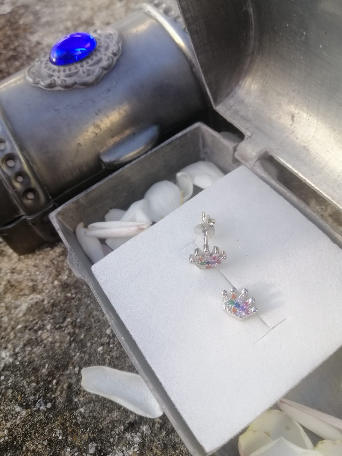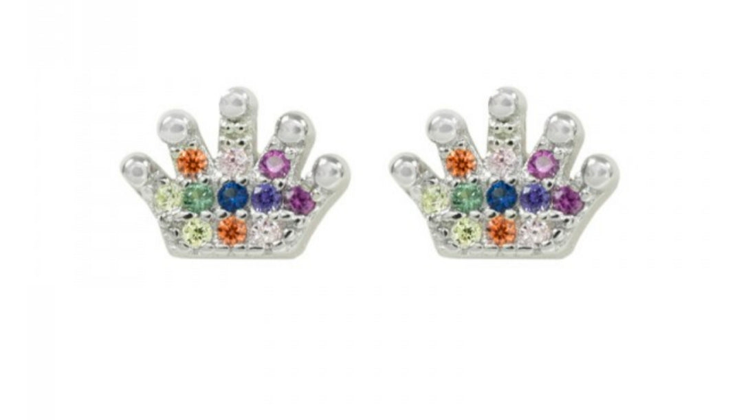 Bonitos y elegantes Pendientes en Plata de Ley 925 con forma de corona y circonitas de colores. Tienen cierre de tuerca a presión.